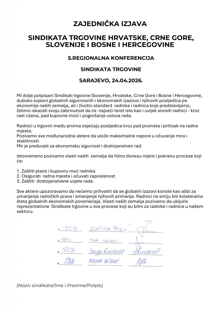 Novosti Zajednička izjava Sindikata trgovine Hrvatske, Crne Gore, Slovenije i Bosne i Hercegovine – 5. regionalna konferencija Sindikata trgovine Posted April 27, 2026April 27, 2026 fiet